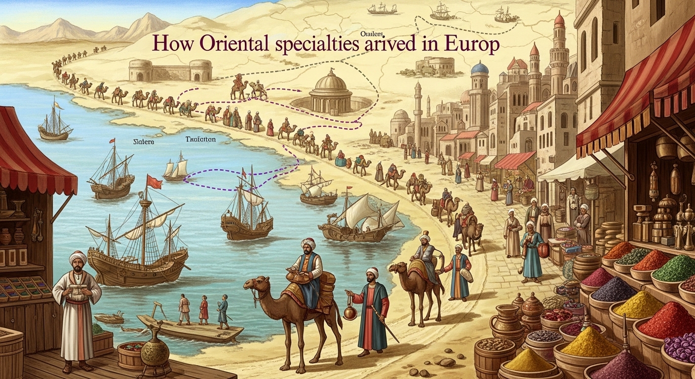 Orientalische Spezialitäten wie Kaffee, Datteln und Gewürze kamen über Handelsrouten wie die Seidenstraße, über Seewege und durch politischen Kontakt – etwa das Osmanische Reich – nach Europa. Händler, Entdeckungsreisen und militärische Ereignisse beschleunigten ihre Verbreitung, sodass sie vom Luxusgut zum festen Bestandteil europäischer Esskultur wurden.